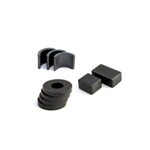Hard ferrite magnets, also known as ceramic magnets, are made primarily from iron oxide (Fe₂O₃) combined with barium or strontium carbonate. They are produced through sintering or pressing methods to form strong, permanent magnets.